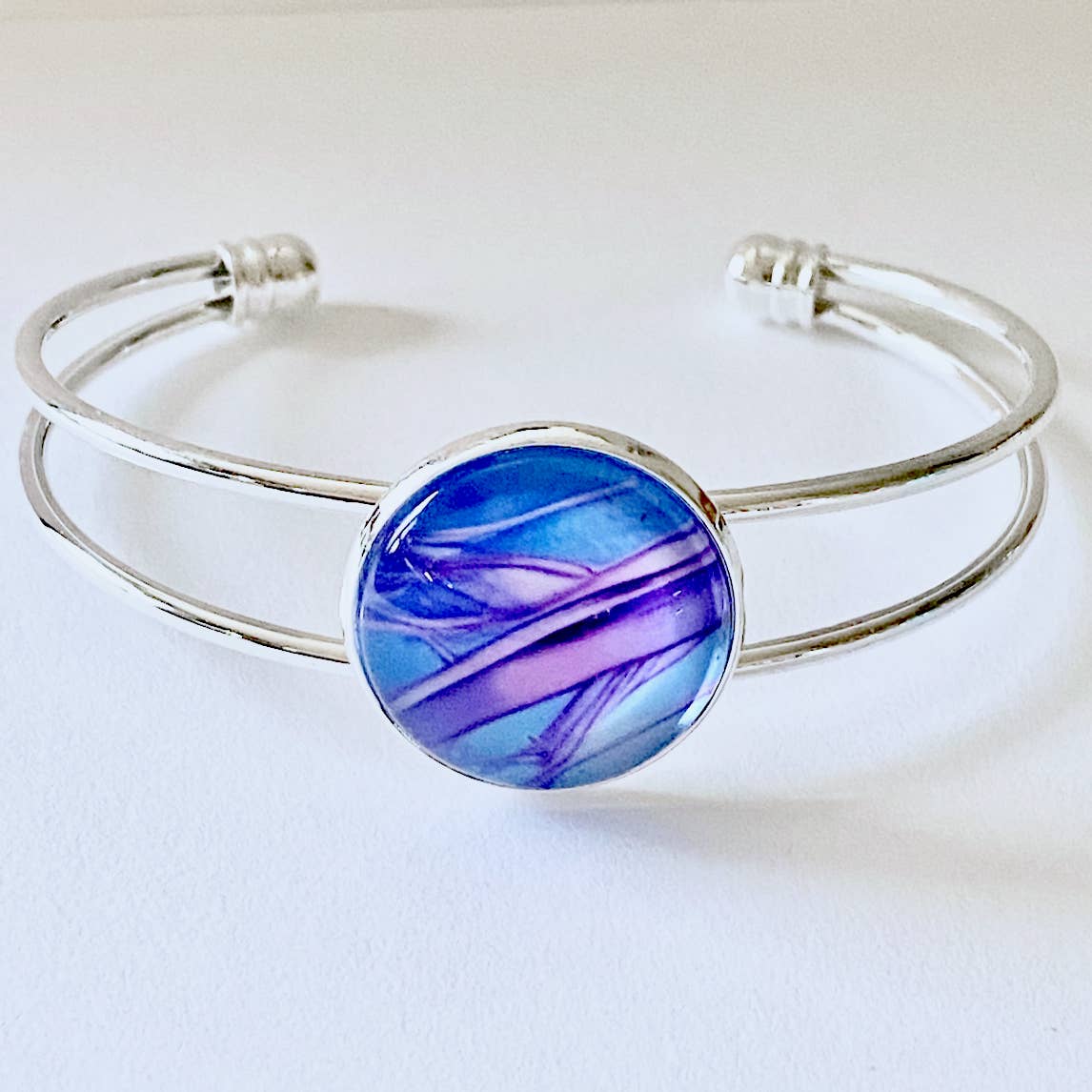 The Bangle Bracelet from the Abstract Collection are designed using original artwork that are set by hand under a 20mm magnifying glass dome. Pair with the matching necklace and add either the post or drop earrings to complete the set. Silver plated brass. Nickel and lead free.