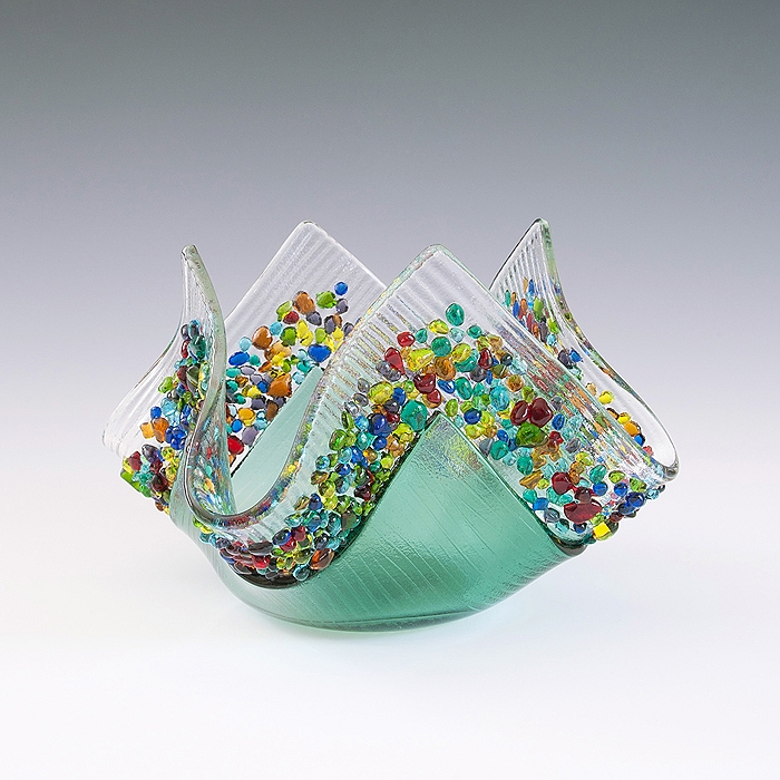 Colorful glass votive with multicolored confetti frit is sure to add sparkle! Tealight candle included.