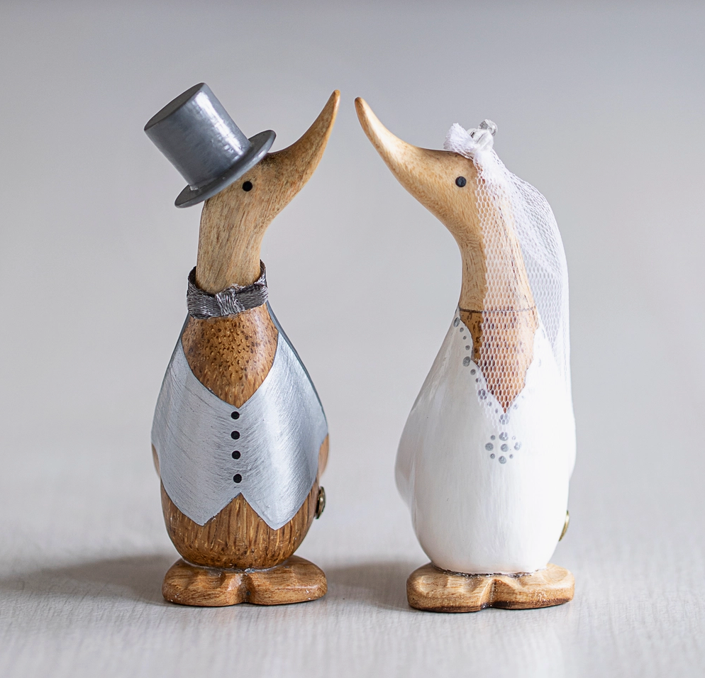 These charming handmade ducks, with their intricate carvings and vibrant colors, make sweet wedding favors, whimsical cake toppers, or unique gifts for the happy couple.