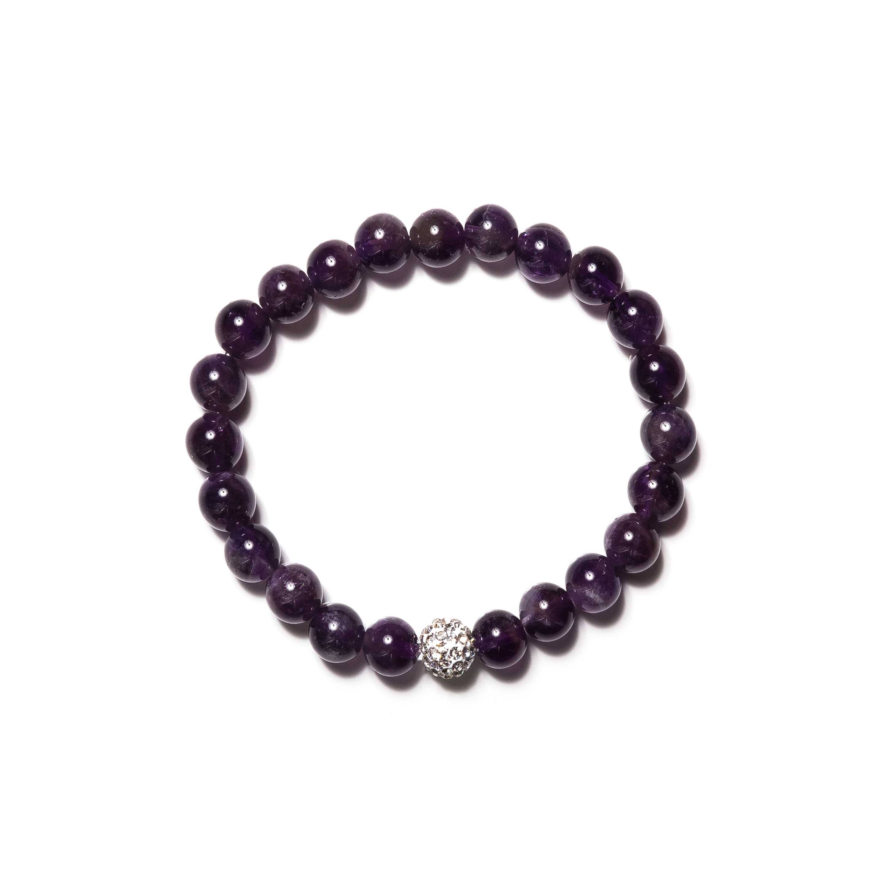 Amethyst beaded bracelet known for its positive energies and protective qualities paired with a crystal fireball will bring inspiration and lots of sparkle to your day. Looks great worn alone and stacks nicely with bracelets from our other gemstone collections.