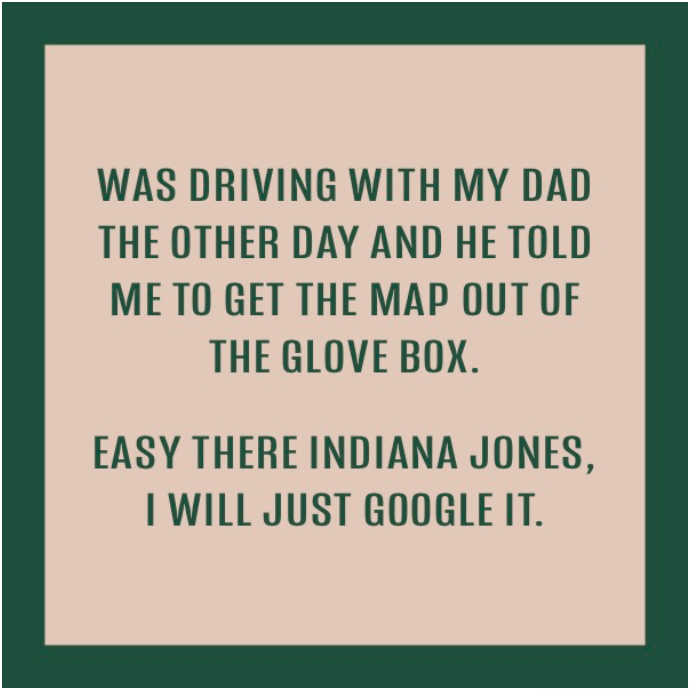 “Was driving with my dad the other day and he told me to get the map out of the glove box. Easy there Indiana Jones, I will just google it.”