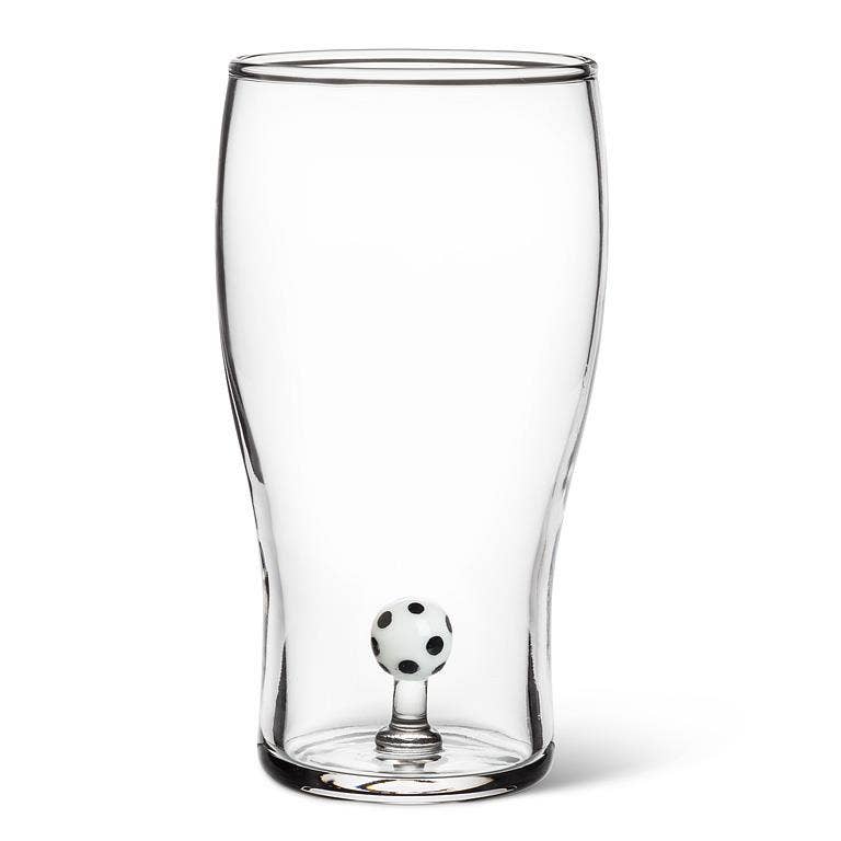 Enhance your sipping experience with this beer glass which features a glass soccer ball at the bottom.